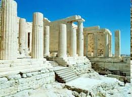 En el Acrópolis, y en el sitio en que estuvieron los viejos monumentos destruidos, se erigieron los santuarios de la ciudad, obra maestra de la arquitectura griega. Una vasta escalera conducía a la roca sagrada, cuya entrada estaba decorada con el pórtico monumental de los Propileos.